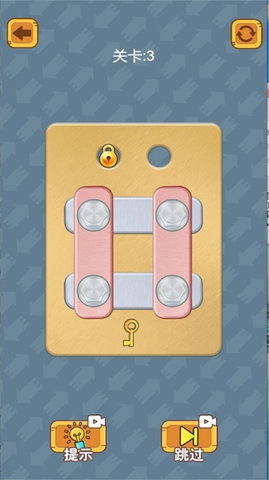 这是一款休闲解压的手指游戏,玩家能体验到创意满满的闯关玩法,感受拧螺丝挑战的乐趣。独特的拧螺丝机制,要求你仔细观察螺丝旋转的细节,找到对应的孔洞,将木板组合连接起来,带来新颖的休闲解压体验,同时考验玩家的逻辑思维和手眼协调能力。首先要仔细观察螺丝的位置与孔洞,点击移动螺丝到合适的孔位,让所有木板都掉落。当然,你也可以使用道具来辅助,获取有用的提示信息帮助通关,这样就能解锁下一关了。