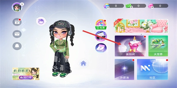 1、点击装扮间进入装扮界面,开启角色装扮的创意之旅,进入专属的装扮空间,准备对角色进行形象打造。