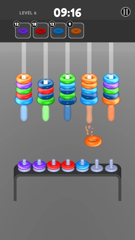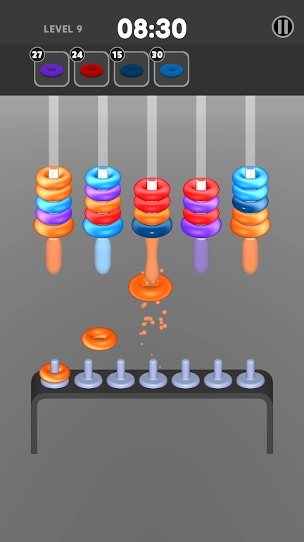 【环形圈相扣(HoopsMatch!)】是一款益智类游戏,一般由多组环形圈构成。每个环形圈的尺寸各不相同,而且前一个环形圈的内部直径恰好能和后一个环形圈的外部直径相契合。玩家需要做的就是把所有环形圈依次嵌套起来,最终让最外面的环形圈把其他所有环形圈都包裹在内。这个游戏的操作并不复杂,快来试试吧!