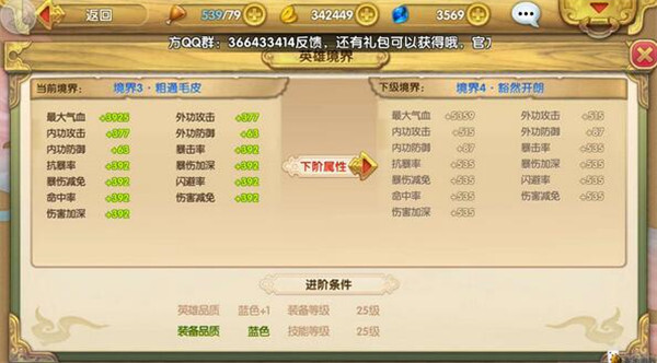 升阶后,英雄品质会得到提升,此时心法栏内的所有经书都会消失,其属性加成会直接整合到人物属性中,同时心法栏会自动切换至下一阶段。