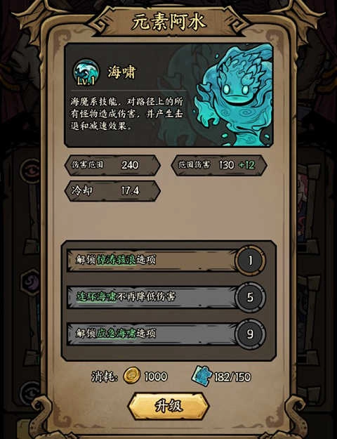 水元素精灵能够召唤海啸,既能击退敌人又能造成伤害;升级之后,它不仅可以带来额外的伤害输出,还能提升自身的速度。