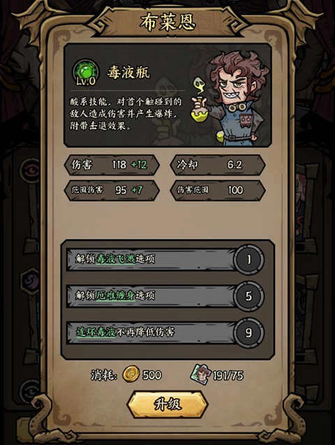 武器是毒液瓶,投掷出去能引发爆炸并产生击退效果,升级后可增加毒液瓶的数量和扩大爆炸范围。