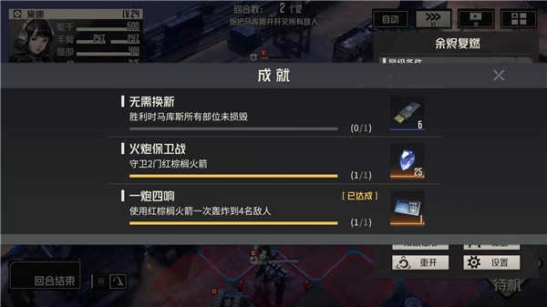 这关同样有个一次性消灭N个敌人的成就,不过有个能轻松达成的小技巧:第一回合先别去破坏载有军需箱的物资车,等第二回合时,用火箭炮对准它轰炸,就能刚好完成这个成就了。