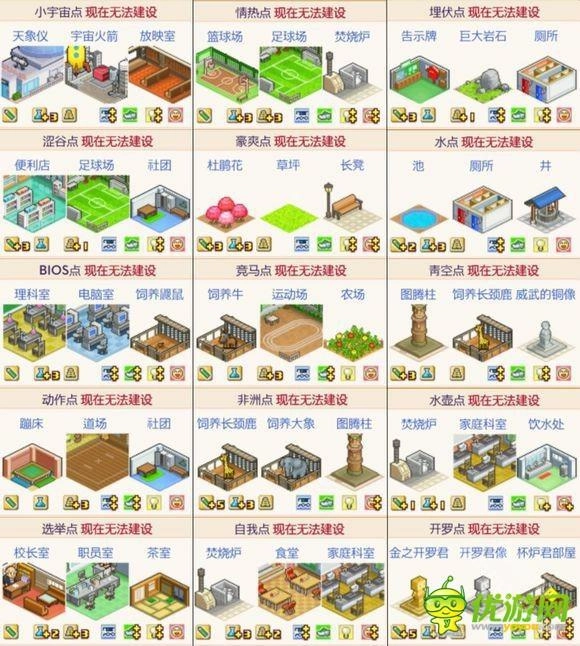 5. 当稳定有4名学生后,就可以着手研究设施了。初期比较理想的搭配是饮水间、茶室和保健室的景点组合。如果资金充裕,优先建造食堂,并且尽量让食堂与小卖部形成三个景点叠加的效果。