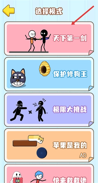 2、游戏主页提供了多种模式供玩家选择,玩家可以在主页自行挑选想要挑战的模式,例如“天下第一剑”“保护修狗王”等。