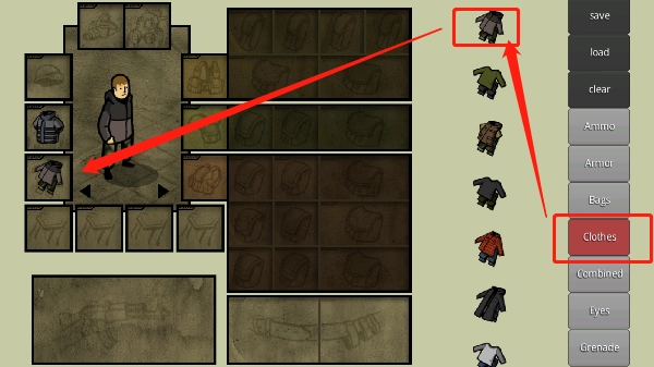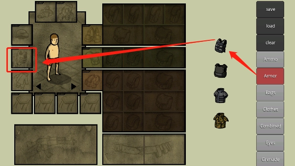 bag对应书包与军用背包,eye对应夜视仪和战术护目镜。请用手将其拖动到人物周边对应的方框里,要是对应方框不对,就不能保留所选的物品。注意:暗色区域需要放置背包之类的物品来解锁贮存空间。