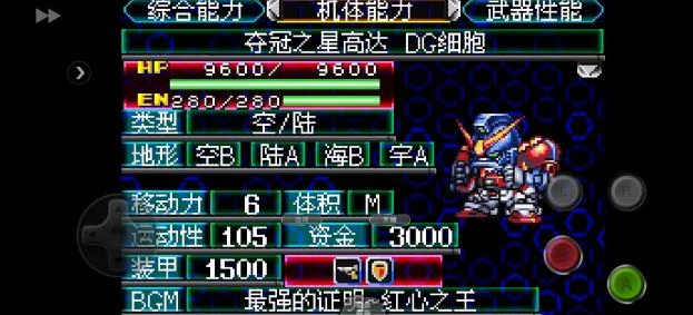 1、该机体于第16话亮相,由机师DG奇波迪操控。这四台经过DG化改造的高达,每回合能自动恢复10%的HP与EN,所有武器的攻击力相较常规状态提升200点;机师的气力每提升10点,其六项基础能力(6维)便各增加2点。其余细节在此不做赘述。