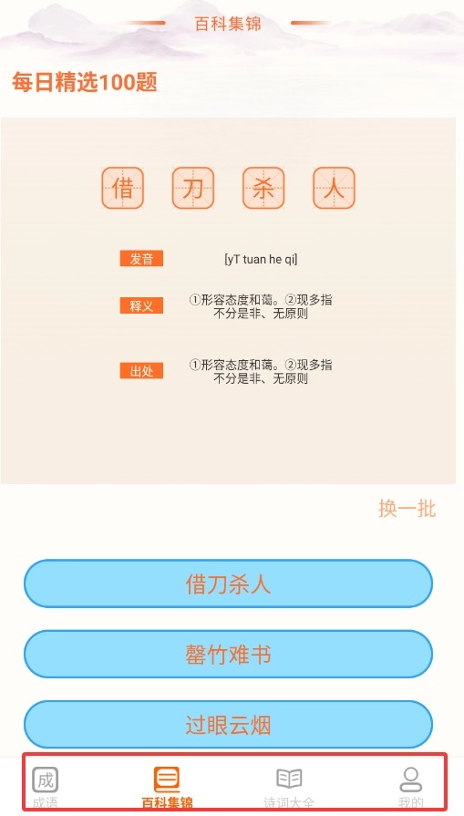 3、除了给出详尽的成语释义外,还创新打造了寓教于乐的学习模式,帮助使用者在轻松的氛围里吸收传统文化的养分,积累深厚的学识。