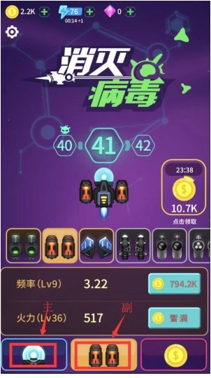 而在下方最左侧的图标就是你的主武器,主武器具备两种属性,分别是火力和射速,这两项属性需要优先升级;火力越强、射速越高,你的生存能力就越出色,清除病毒的效率也会越高。