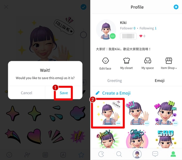 2、【Save储存】→【自己制作的表情贴就会显示出来啦】
