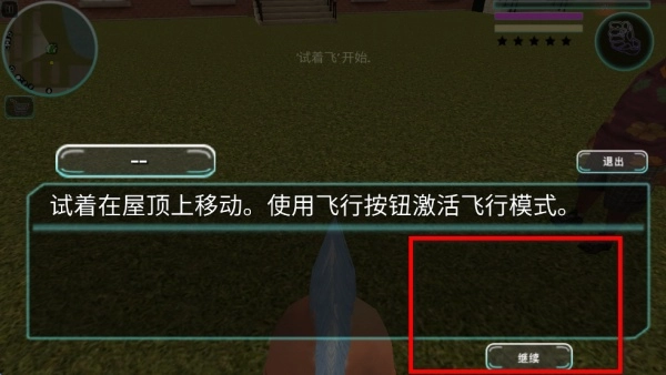 2、留意界面上的提示信息,依照指引点击继续按钮,启动试飞流程。激活飞行模式后,试着在屋顶区域进行移动,以此熟悉飞行操作的方法与节奏。