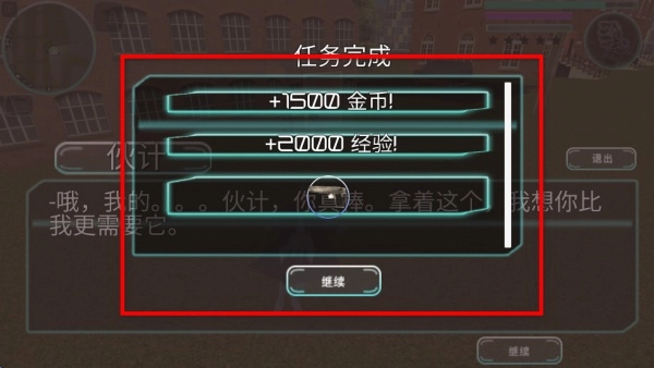 4、任务完成后会弹出结算界面,从中可获取金币与经验奖励,点击“继续”按钮即可关闭该界面,进而继续参与后续的沙盒互动或任务挑战。