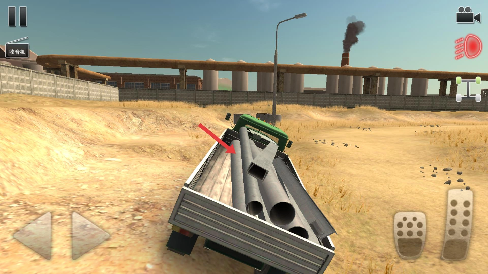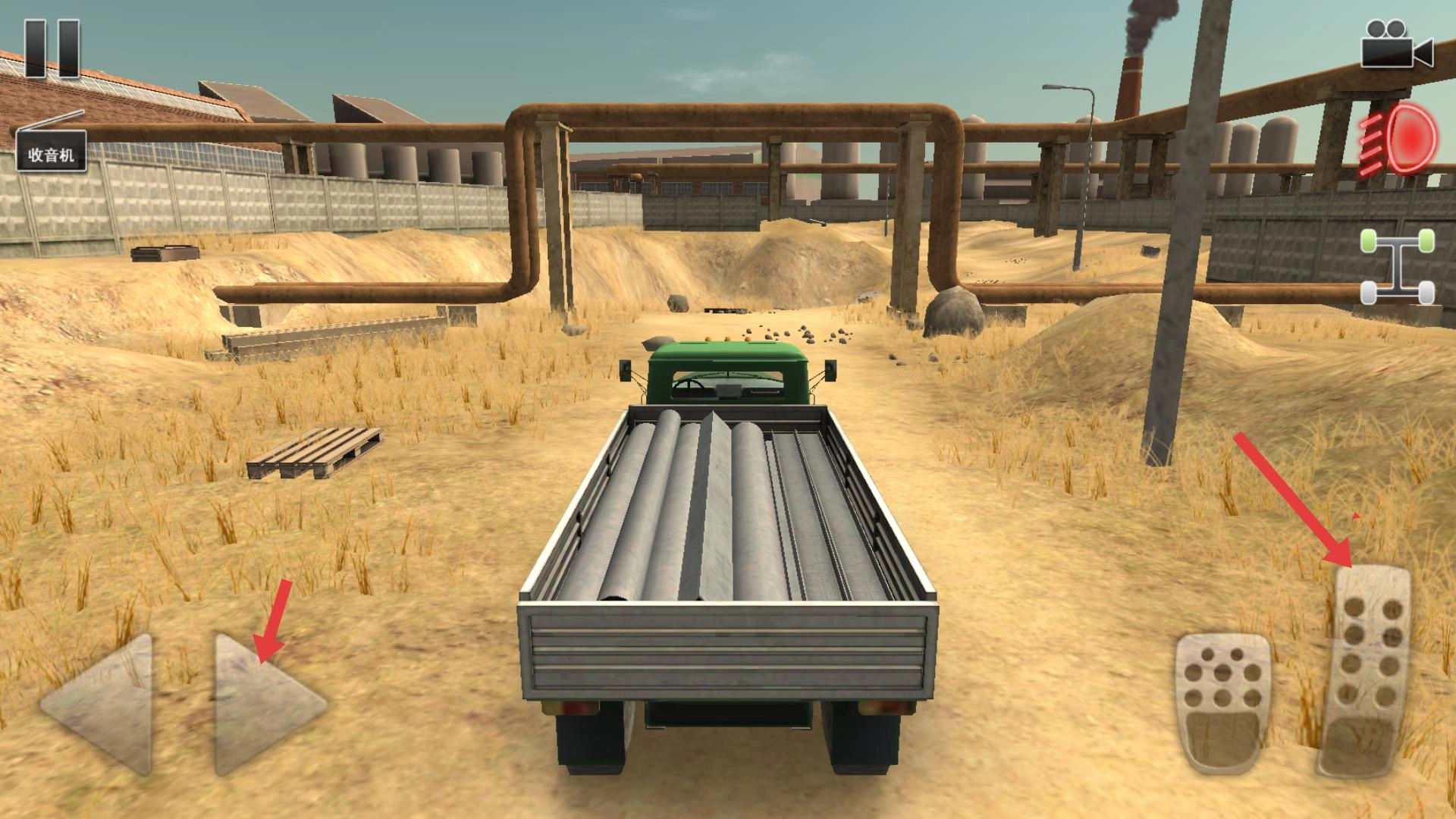 进入驾驶界面后,可通过左侧的方向按钮操控卡车转向,右侧的踏板按钮调节车速,驾驶时需谨慎操作,保证卡车平稳运行,顺利完成货物运输。