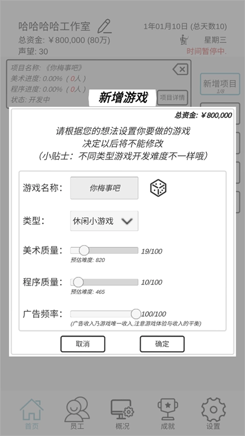 1、开启项目前先给工作室起个名字,初始资金为50万元,还能额外得到两份新手礼包(每份都包含2万元启动资金)。名字看似是小事,却是建立品牌意识的第一堂课。