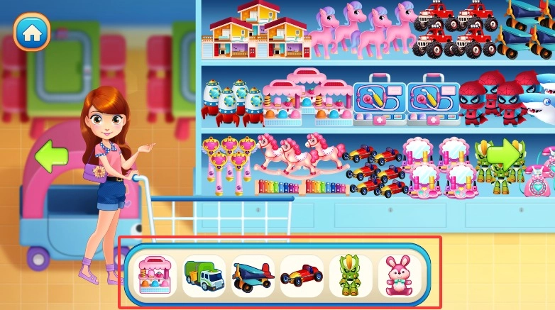3、依据顾客的具体需求,从下方挑选对应的玩具商品,并在货架上准确找到后放入购物车。
