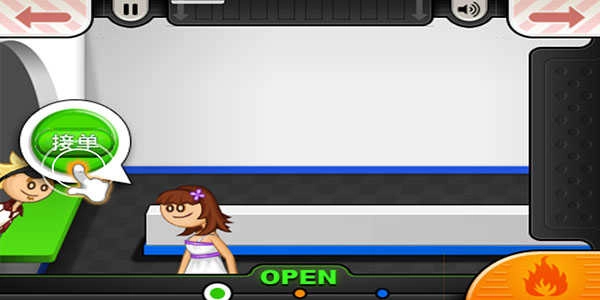 1、进入汉堡店后,先到接单区域,点击界面左侧的绿色按钮,即可开始接待顾客并接收点单。
