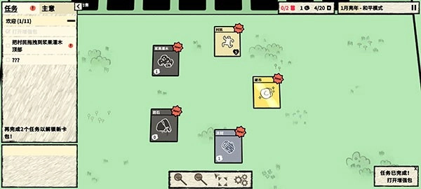 4、总共得到了木材、浆果灌木、村民、岩石和硬币这五张新卡牌,依据左侧的任务提示,对这些卡牌进行移动操作。