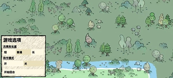 1、一进入叠层世界,界面会自动显示为中文。首先点击“开始新回合”,接着进行设置:可以选择是否开启和平模式;月亮年长度方面,设置为“短”意味着游戏内一天的时间流逝更快,设置为“长”则表示一天的时间过得更慢。确认好这些设置后,点击“开始回合”即可。