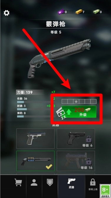 3.在武器界面消耗金币升级枪械属性,强化火力输出与弹容量,让战斗表现持续提升,变得更强。
