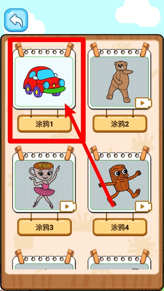 2.关卡选择:图册里呈现了多幅涂色作品的预览,点击“涂鸦1”这类卡片就能进入创作界面,还能解锁更多题材,大家可以根据自己的喜好自由挑选来进行涂色。