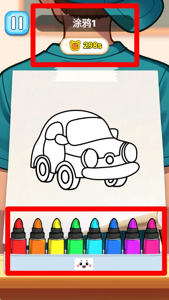 3.涂色界面:顶部呈现关卡信息与倒计时,左边设有暂停按钮,中间是小汽车的线稿图,下方的彩笔栏支持选择颜色后点击对应区域进行上色操作。
