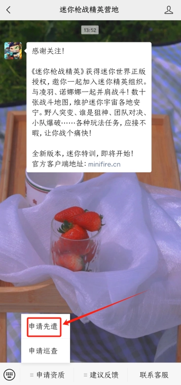 1、打开微信搜索迷你枪战精英找到营地的公众号