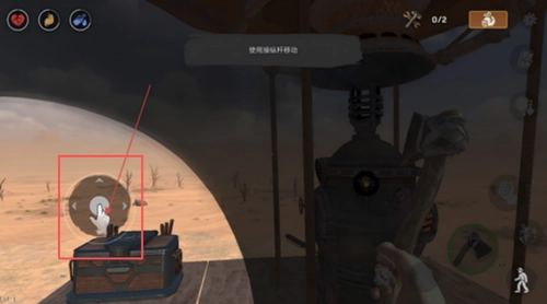 2、滑动左侧的虚拟操纵杆来操控角色移动,以此探索漂浮的木筏以及周边的沙漠场景,同时要留意资源点的具体位置。