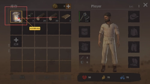 4、打开背包库存界面,点击罐头食品或其他补给品进行使用,以恢复角色的饥饿状态与生命状态。