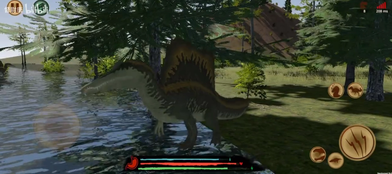 1、首先需要操作左下角的摇杆控制恐龙走到水中;