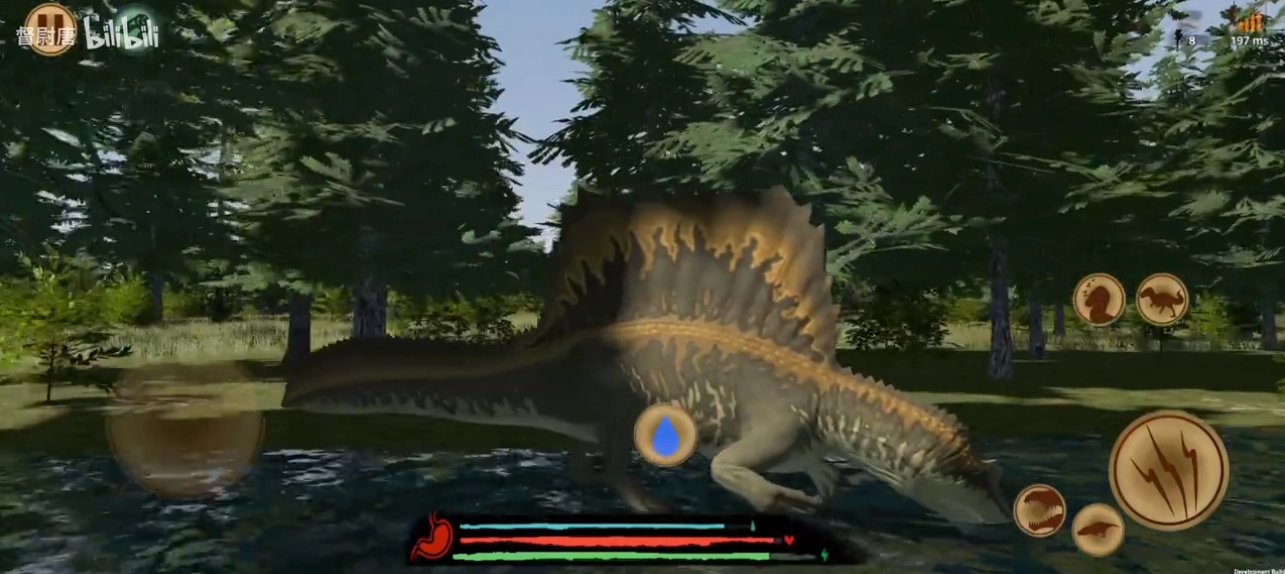 1、界面:界面设计简洁直观,主屏幕左侧区域用于操控恐龙的移动,右侧分布着攻击、奔跑、休息与喊叫功能的按钮。屏幕正下方设有三个进度条,分别以蓝色、红色、绿色对应显示玩家的饥渴值、血量和精力条等状态属性。