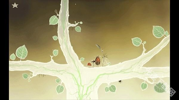 4、走到树枝的尽头,那里有一片黄色的叶子,点击它就会出现一只大蜜蜂,它会吐出第一根羽毛,羽毛随后掉落到下方一层的树洞里。