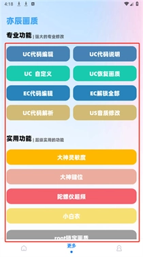 8、在更多页面,我们为大家提供了UC代码编辑、大神灵敏度、陀螺仪超频等功能供使用。