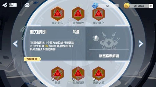 专属技能【重力封印】对单体进行普通物理攻击,造成1%的损血(1级时),同时附加相当于损失血量1.8倍的额外伤害。