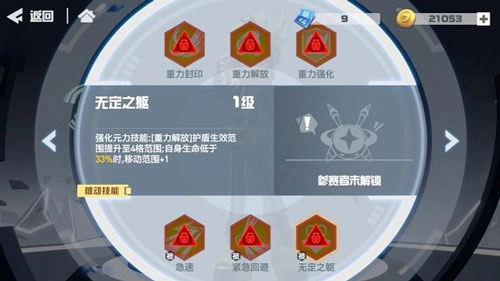 【无定之躯】强化元力技能,[重力解放]护盾生效范围扩展到4格,当自身生命值低于33%时,移动范围增加1格。