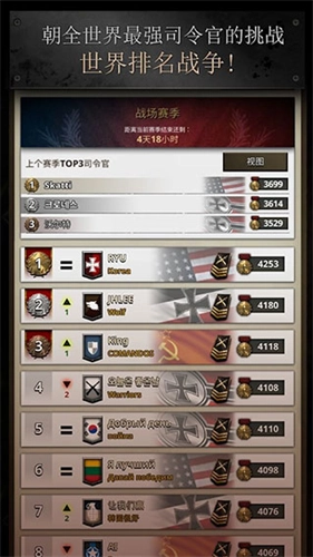 5、战斗的胜负会影响排名积分的增减,你可以和全球玩家一同角逐“世界最强指挥官”的称号。