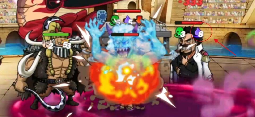 从上图可以清楚看到,带有百分比掉血保护的路飞太郎,在五条毒龙的冲击下,血量被迅速清空,最终被击杀。