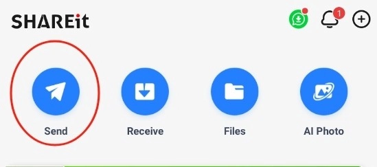 若想通过SHAREit传输文件,你需要先打开该应用,然后点击主页上的【Send】按钮。
