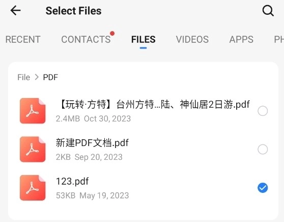 接下来在文件列表里挑选需要传送的文件,要是文件数量比较多,你可以先选定文件类别,再慢慢查找。