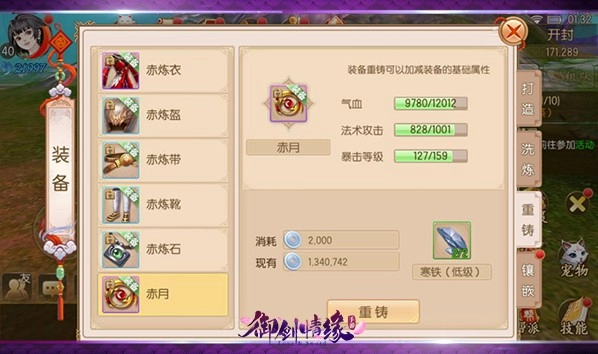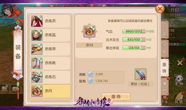 此时我们可以再次打开打造界面的重铸栏,查看该装备当前的属性以及属性上限。要是对自己打造的装备属性不太满意,还能利用分解其他装备得到的“寒铁”来对装备进行重铸,以此重置它的属性(不过重铸有一定几率会倒扣属性,所以在进行重铸操作前请务必谨慎考虑)。