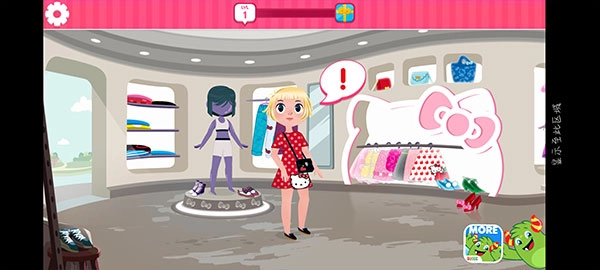 2、玩家会进入凯蒂猫的服装店铺,点击“!”来接待第一位顾客。