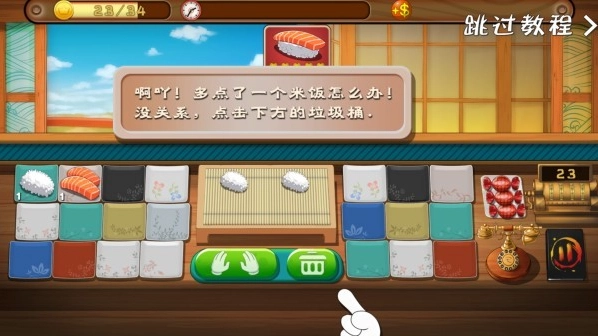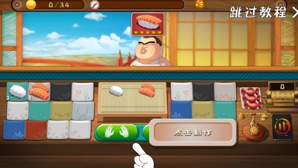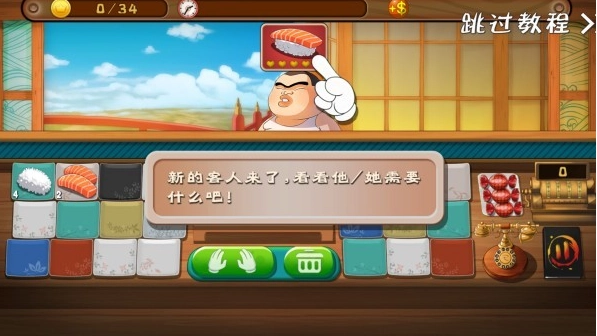 2、初次体验这款游戏时,我们可以跟随教程来熟悉玩法。在经营寿司店的过程中,顾客是核心所在,我们需要留意他们所需的食物种类,并及时制作出来提供给他们。