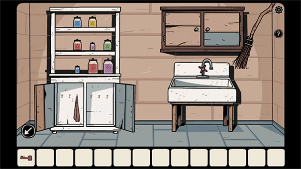 2、推开那扇蓝色的门进入盥洗室,依据照片上的提示将架子上的罐子摆放妥当,完成后取走下方的「钥匙」。随后打开水池上方的柜子获取「对讲机」,再出去用钥匙打开钟表左边的门。