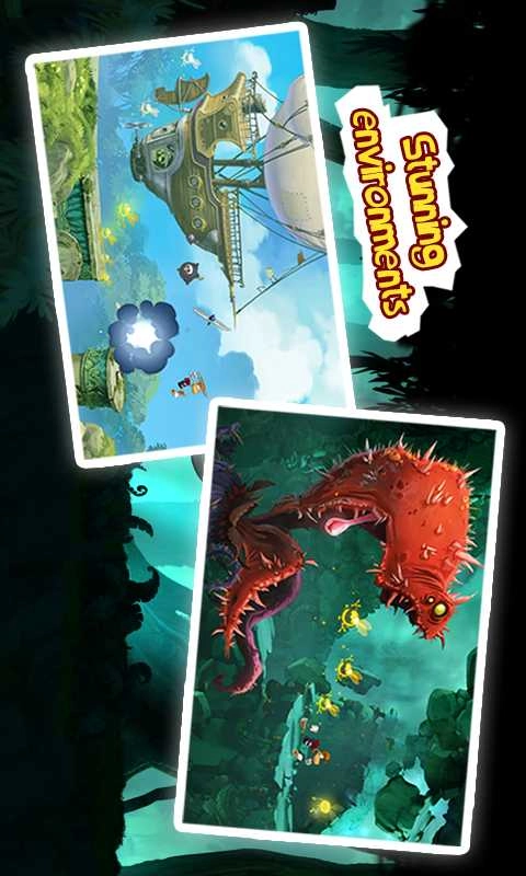 1.《雷曼丛林探险》的设计风格极具特色,凭借动画质感的画面与绚丽多彩的色调营造出鲜活灵动的氛围,让玩家宛如踏入一个奇妙的丛林秘境。