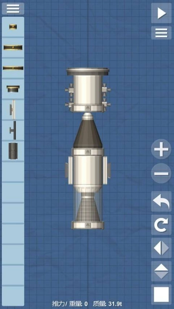 1、启动航天模拟器,点击创建新火箭,先搭建一个中等尺寸的燃料箱,接着在其下方安装分离器,再添加控制室和降落伞。