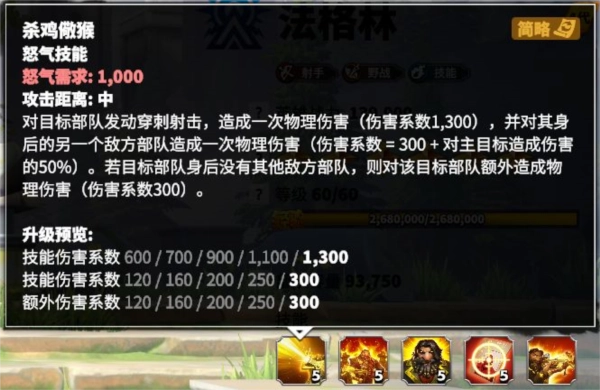 对目标造成高额物理伤害,同时依据这次伤害数值,对目标后方的另一支敌方部队追加一次物理伤害;若目标身后没有其他敌军,则改为对目标本身造成额外伤害。这是法格林的核心技能,我们分情况剖析:第一种情况,目标身后无其他部队时,该技能相当于一次不带特殊效果、倍率为1600的主动技能,这个倍率表现还算出色;第二种情况,目标身后存在其他部队时,技能会转化为两段伤害——第一段是1300倍率的无特殊效果主动伤害,第二段除了300倍率外,还会附加主目标所受伤害50%的额外伤害;尽管这50%的额外伤害会被主目标的防御削弱,但整体伤害依然相当可观。实战里,要是触发了二段伤害效果,通常第一段会命中敌方前排,第二段则能打到敌方后排,实现“隔山打牛”的效果,给敌方后排造成显著战损。