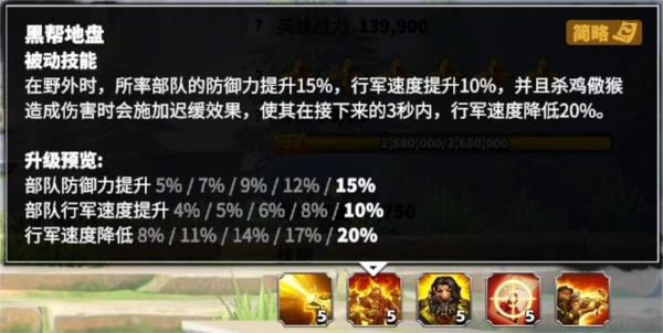 提升所率领部队的防御能力与移动速度,主动技能在造成伤害的同时还能附加减速效果。这是一个侧重防御和增强部队拉扯能力的技能,效果尚可但对输出提升作用有限,不必优先升级。
