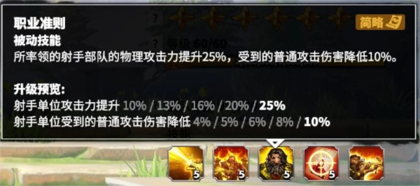 提升射手部队的物理攻击力,降低所受普通攻击的伤害。这是常见的输出增益技能,同时还能增强一定的生存能力,整体效果出色。