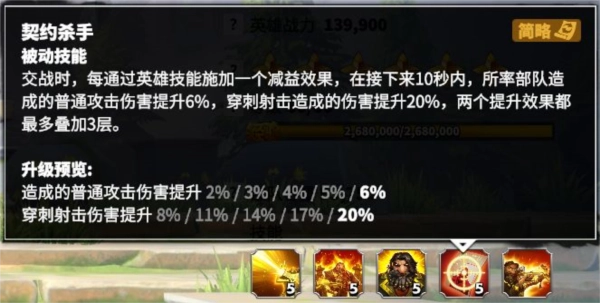 战斗时,每次通过英雄技能施加一个减益效果,接下来一段时间里普通攻击与穿刺射击(法格林的主动技能)造成的伤害会提升,这两种效果最多可叠加三层。数值提升相当显著,满级技能叠满后能增加18%的普通攻击伤害和60%的穿刺射击伤害,可大幅增强部队的输出能力;该技能的核心特点是,除了自身二技能外,还需搭配其他技能才能尽可能提高效果覆盖率;具体的搭配方式可参见下文的“英雄搭配”部分。