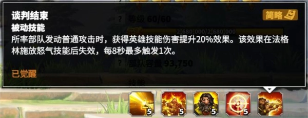 法格林所率部队发动普通攻击后,能获得英雄技能伤害提升的效果,该效果会在法格林释放怒气技能后失效;且每八秒内最多触发一次英雄技能伤害提升效果。这个技能效果相当不错,经过实际测试,其在实战中的运行逻辑为:进入战斗后,法格林进行普通攻击,随即获得增益;8秒后该技能冷却完毕,若此时法格林释放技能,增益会消失;之后法格林再次普通攻击,又能获得增益,此时副将释放技能也可享受该增益。因此在实战中,这个技能基本能全程覆盖主将和副将,所以不必过于纠结法格林是作为主将还是副将使用。