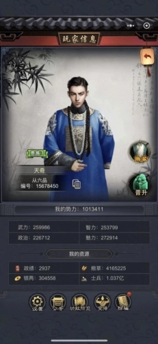 玩家的势力值由武力、智力、政治、魅力这四项属性综合相加而成,这些属性的提升主要依靠强化门客来实现。其中,智力会对每次征收的钱财数量产生影响,政治属性关联着粮食的获取量,魅力则左右着招兵的人数,而武力属性在过关卡、PK以及打副本时的数值表现中起着关键作用。